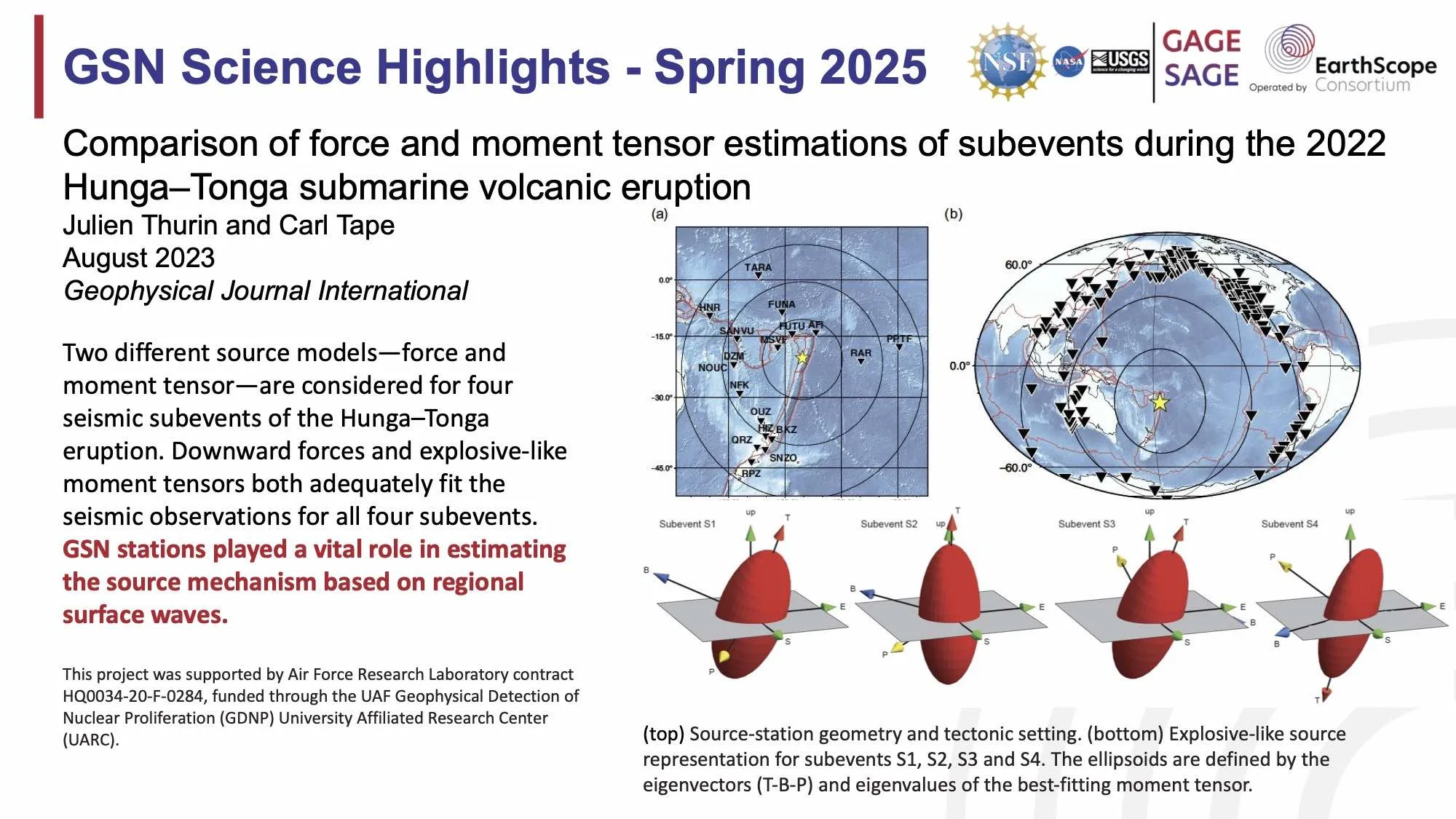 The Global Seismographic Network (GSN) is an approximately 150 station, globally distributed, state-of-the-art digital seismic network that provides free, realtime, open access data. The GSN is a cooperative scientific facility operated jointly by the National Science Foundation (NSF) and the U.S. Geological Survey (USGS), in coordination with the international community. This multi-use scientific facility is a societal resource for Earth observations, monitoring, research, and education.